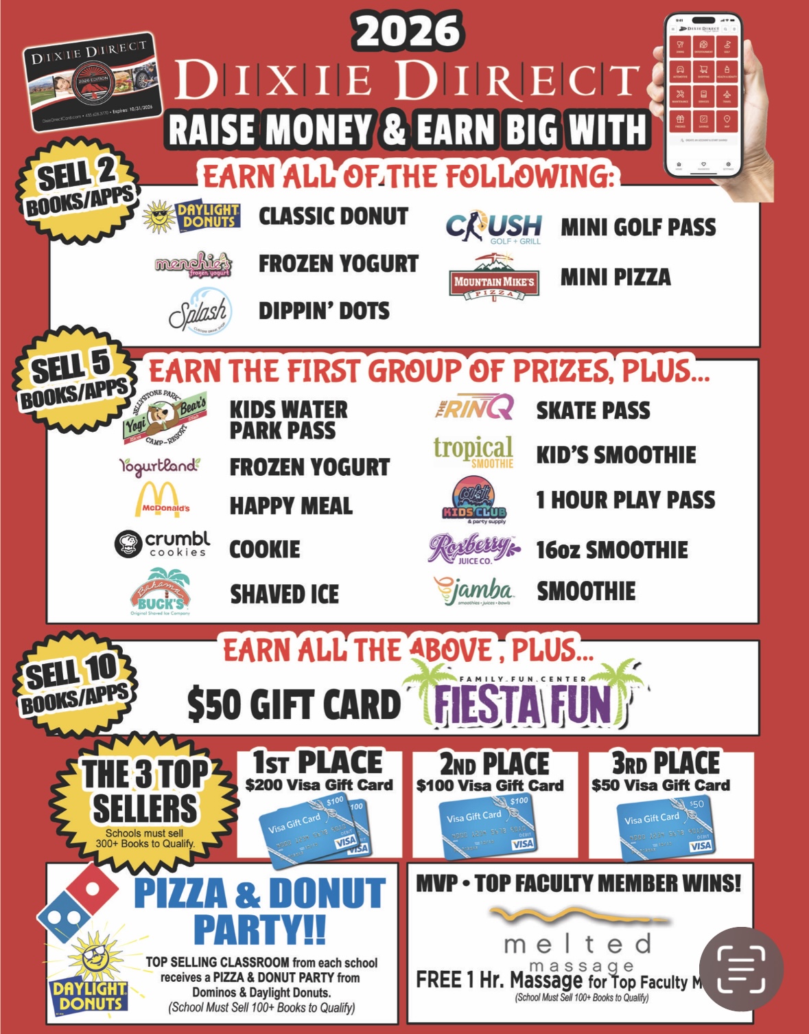 We now have the 2026 Dixie Direct Books available for purchase in our office. An information flyer will be sent home today. Students can earn prizes for selling the books. https://www.